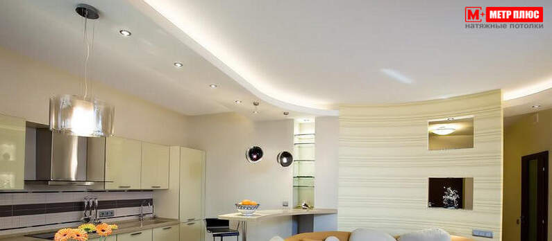 При установке натяжного полотна можно грамотно разместить встроенные светильники, которые будут подсвечивать определённую зону, тем самым экономя энергию на ненужной подсветке всего помещения. Все линии коммуникаций, проводки будут спрятаны за натяжным полотном. Так же это отличная возможность скрыть неровность родного потолка. Можно улучшить звукоизоляционные свойства помещения, расположив звукоизолирующую прокладку за потолком.